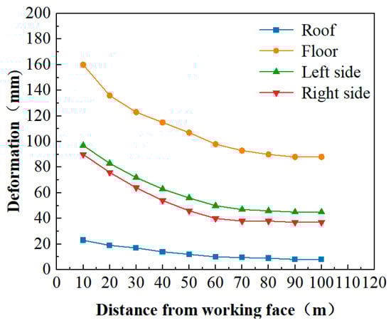 As shown in Figure 5f, when the working face advanced to 420 m (15 m ahead of the 500 m monitoring point), the surface displacement of the floor and coal pillar rib at this location increased significantly. The convergence deformation of the roof, floor, coal pillar rib, and coal wall rib reached 51 mm, 324 mm, 200 mm, and 242 mm, respectively. This demonstrated an asymmetric failure pattern characterized by severe floor heave, greater deformation in the coal pillar rib compared to the coal wall rib, and relatively stable roof conditions. The significant contraction of the roadway cross-section severely impacted the safe and efficient production of the working face.