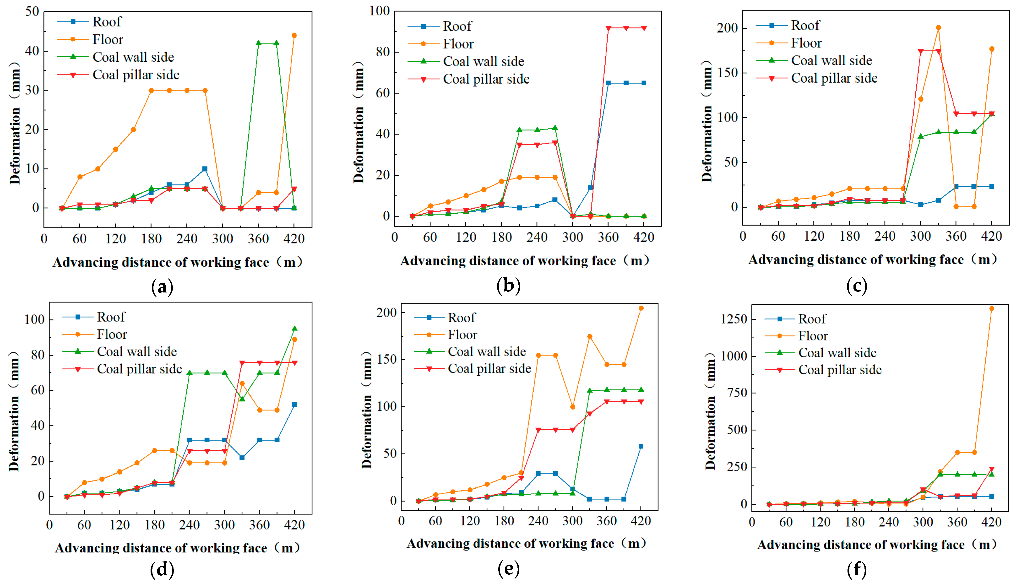 2.2. Failure Characteristics of Surrounding Rock in Retained Roadway During Secondary Mining