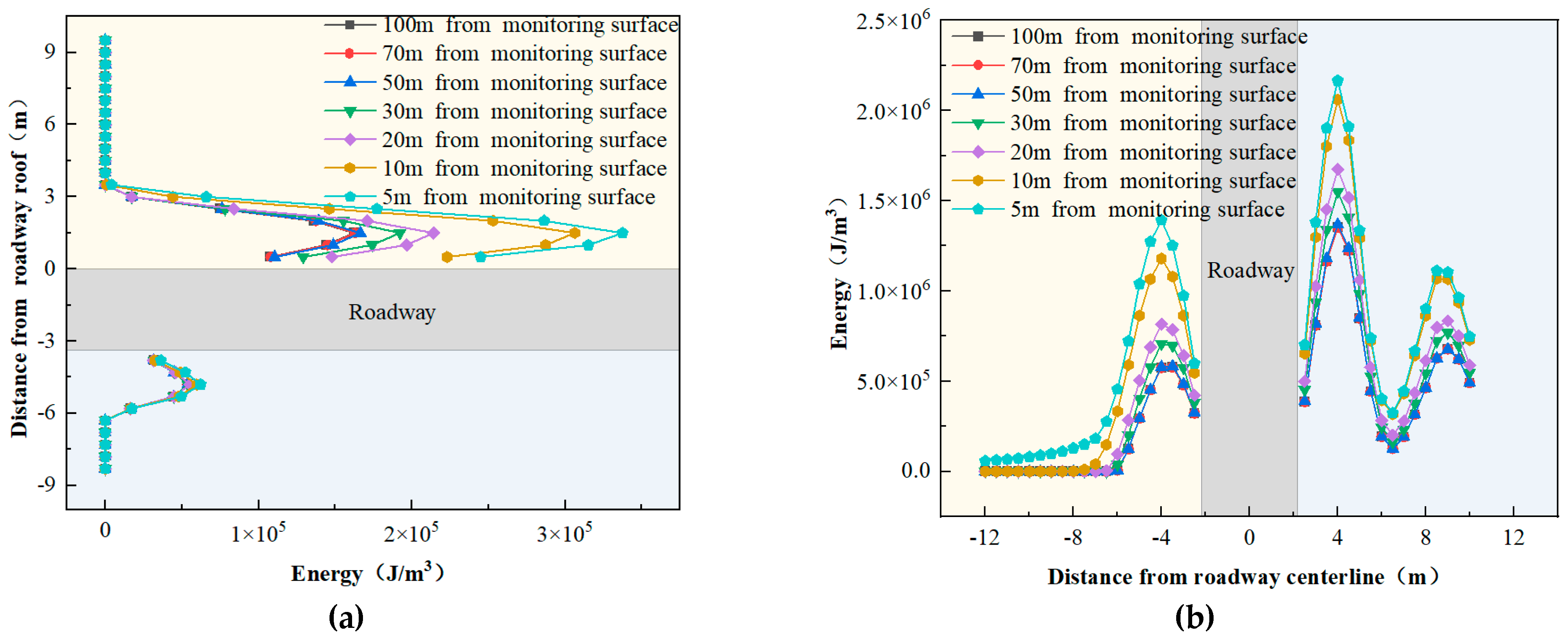 3.3.2. Dissipated Energy Distribution in Retained Roadway Surrounding Rock When the Working Face Is 10 m from the Monitoring Section