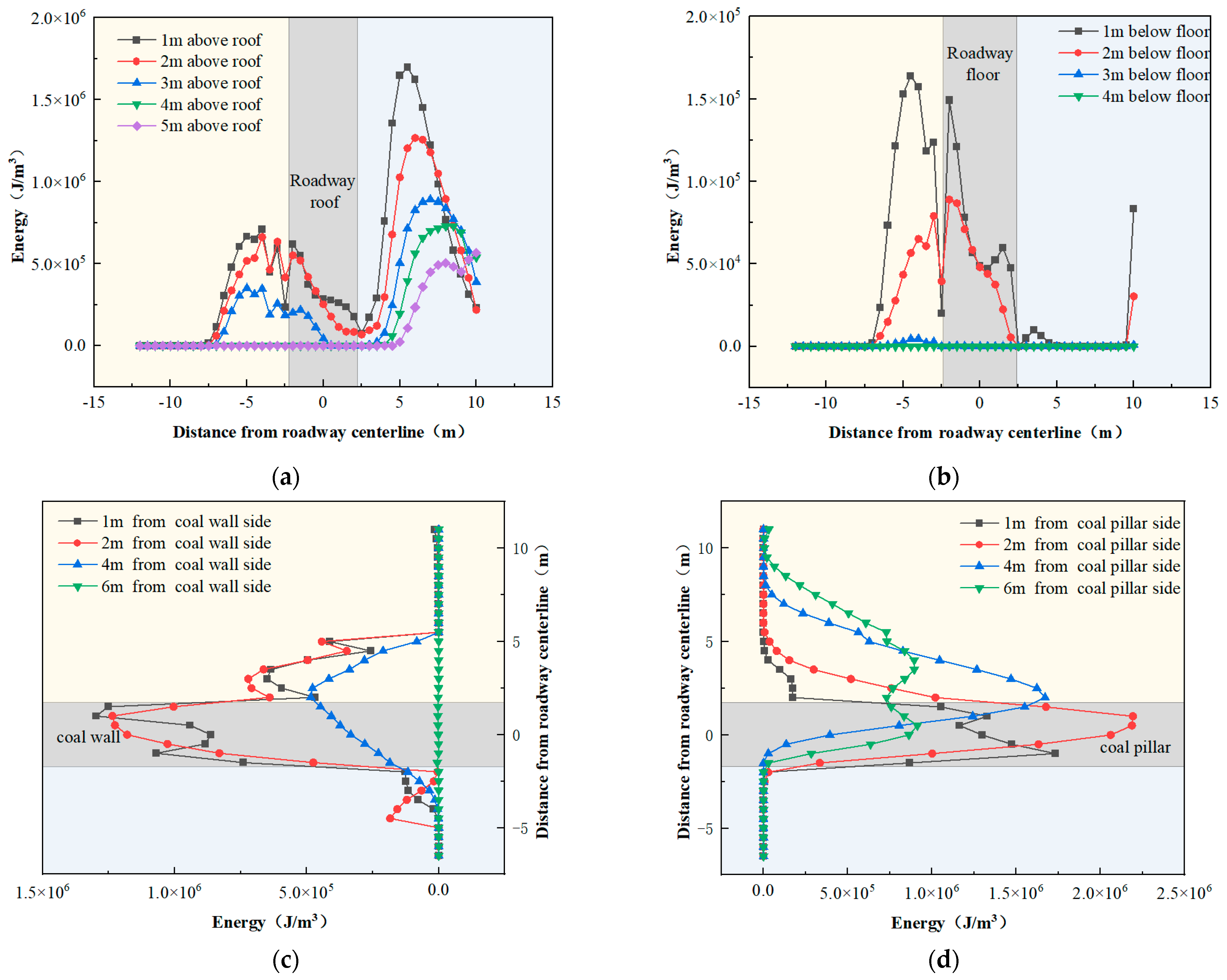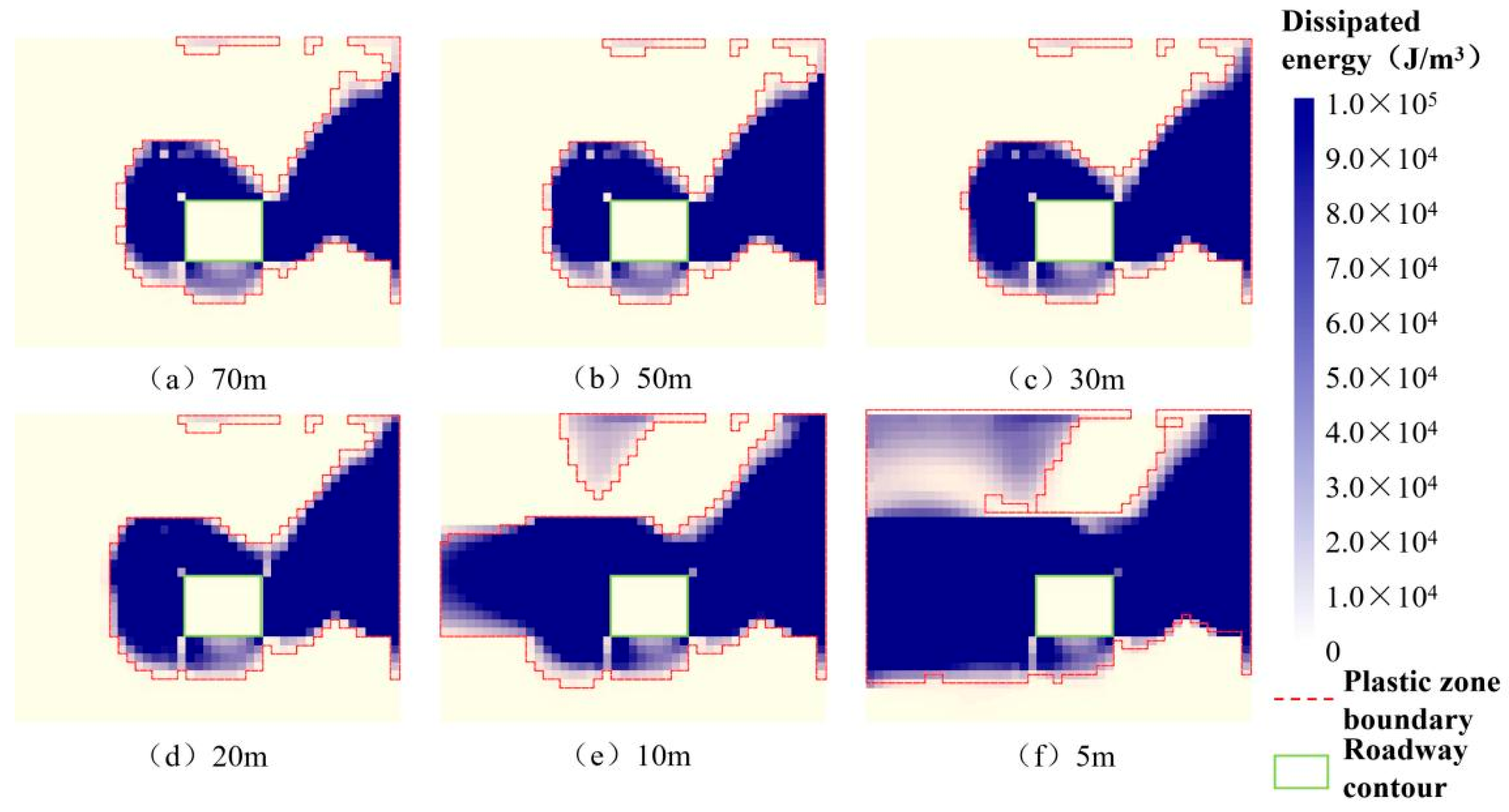 - Under the superimposed influence of goaf-side abutment pressure and secondary-mining-induced advance abutment pressure, the energy dissipation distribution in different zones of the retained roadway surrounding rock exhibits significant heterogeneity. The energy dissipation intensity decreases progressively with increasing distance from the roadway surface, demonstrating an asymmetric distribution pattern as follows: coal pillar rib > roof (coal pillar side) > solid coal rib > roof (solid coal side) > roof center > floor > floor (solid coal side) > floor (coal pillar side).
