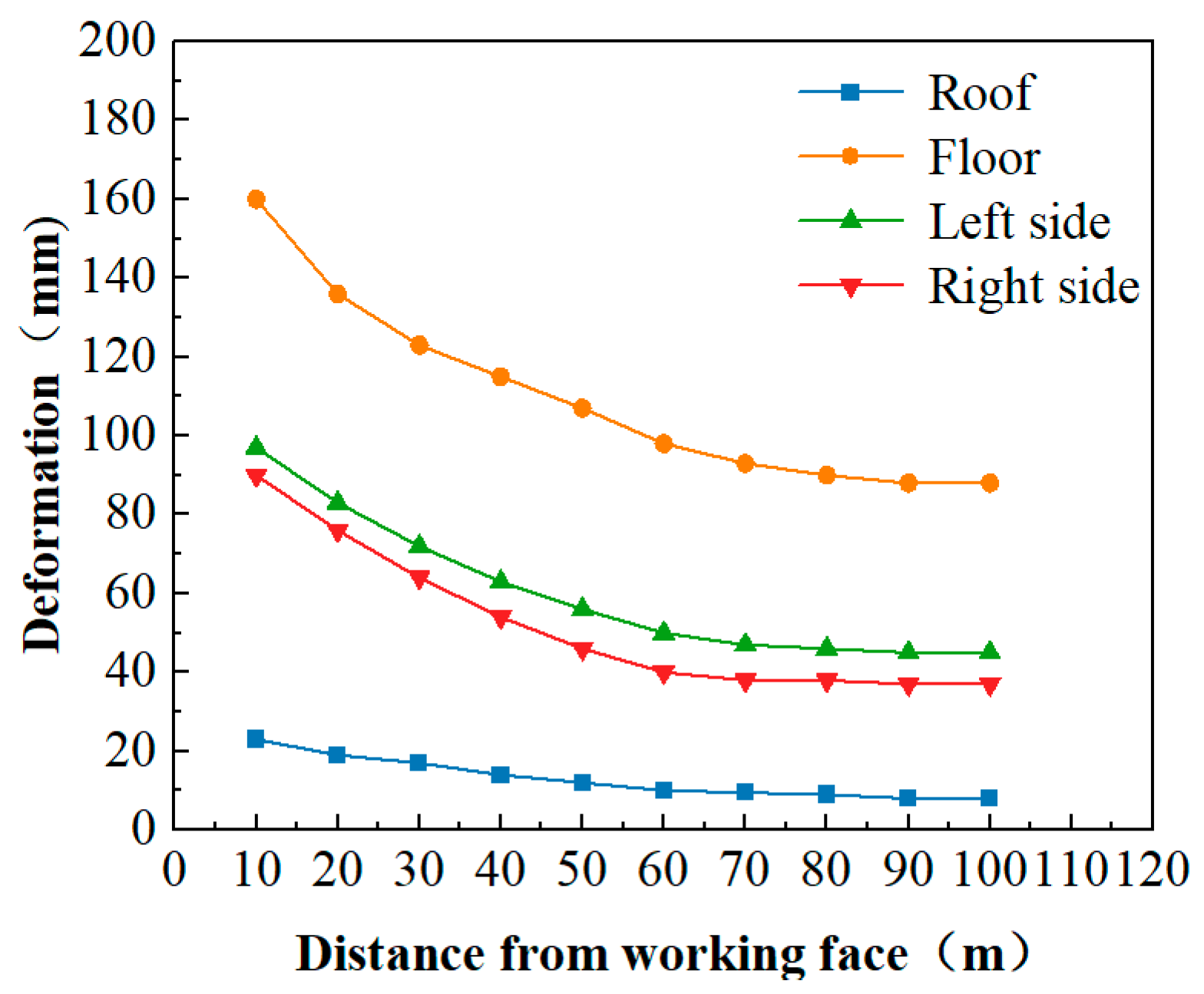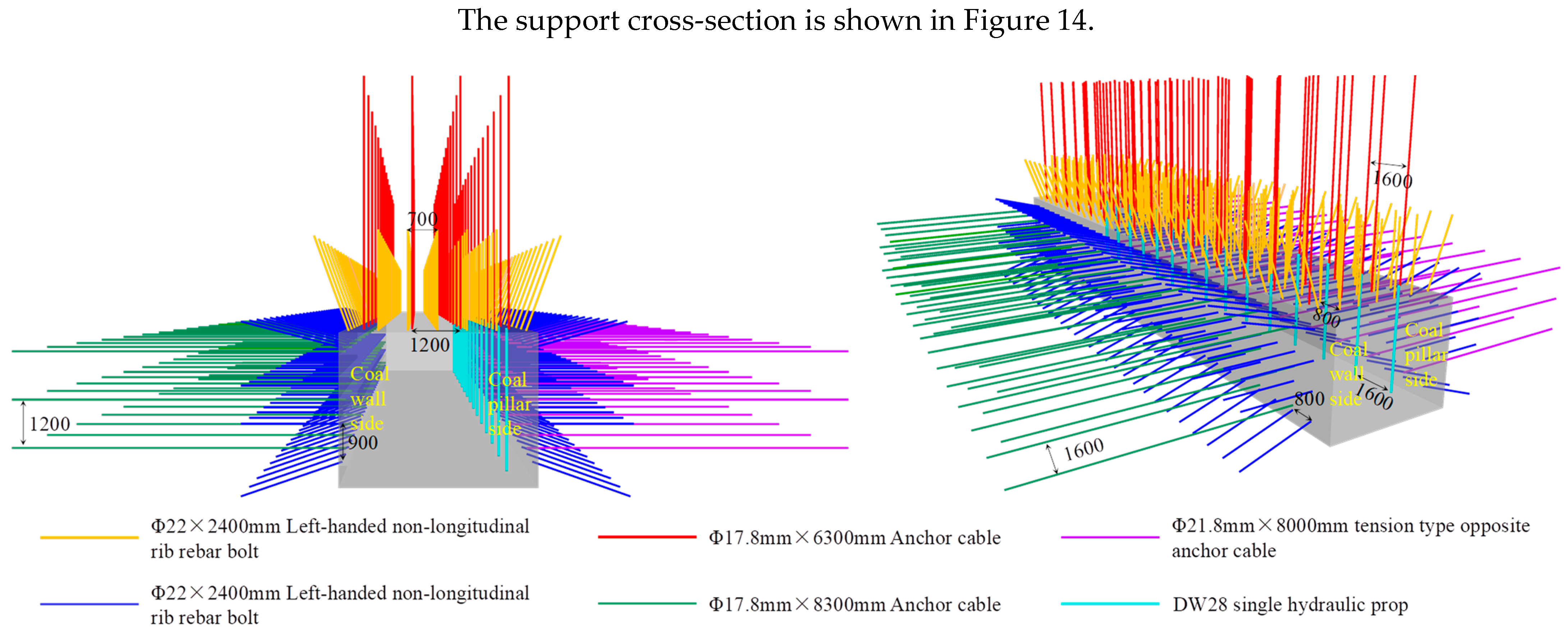 - The energy dissipation and plastic zone increase sharply when the second mining face is 10 m ahead, and the depth of plastic zone of the roof and coal wall is 3.5 m and 4.5 m, respectively; according to this, hydraulic props are set 20 m ahead to control roof instability of roadway, and lengths of bolts/cables match the depth of plastic zone to ensure that they are anchored to a stable rock layer. Dissipative energy has asymmetric distribution characteristics; according to the asymmetric distribution of dissipated energy, the two sides of the roof are designed to be inclined by 20°, and the upper two sides are designed to be inclined by 15°; plastic zones at the top corner where penetration is easy are reinforced, and floor hardening measures are designed to isolate water damage, suppress floor heave, and balance asymmetric deformation.