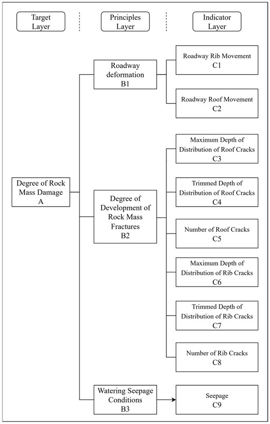 The fuzzy analytic hierarchy process requires the construction of a three-layer evaluation system comprising the target layer, principles layer, and indicator layer. In this paper, the target layer is degree of rock mass damage (A); the principles layer is roadway deformation (B1), degree of development of rock mass fractures (B2), and watering seepage conditions (B3); and the indicator layer is roadway rib movement (C1), roadway roof movement (C2), maximum depth of distribution of roof cracks (C3), trimmed depth of distribution of roof cracks (C4), number of roof cracks (C5), maximum depth of distribution of rib cracks (C6), trimmed depth of distribution of roof cracks (C7), number of rib cracks (C8), and seepage (C9). The method for calculating weights using FAHP is as follows [30]: