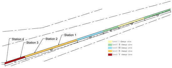 The results of the classification indicate that damage patterns of the same grade are generally distributed continuously. There is one area of Grade II damage located within a Grade III damage zone and one area of Grade III damage located within a Grade III damage zone. For the sake of consistency and safety in support design, both of these areas are treated as higher-grade damage during support design. The grading range of the roadway is shown in Figure 2: