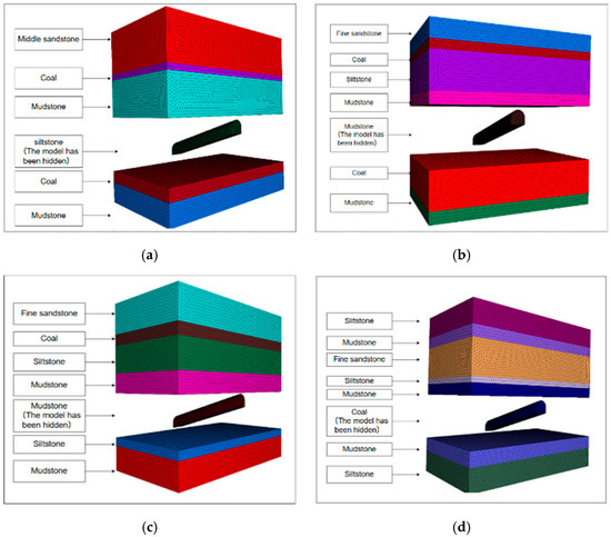 Based on the graded control schemes for each damage zone and support parameters derived from the preceding sections, numerical simulations are conducted. The inclined section of the auxiliary transportation roadway of the northern wing is over 600 m in length, making overall modeling impractical. Therefore, except for the Grade I damage zone that does not require support, segments are selected from the remaining four damage zones based on the distribution of rock layers in the borehole columnar diagrams for modeling. The model dimensions are all 60 m × 30 m × 60 m, employing the Mohr–Coulomb constitutive relationship. A 10 MPa load is applied to the top surface with a pressure coefficient of 0.9. No displacement occurs on the remaining five surfaces. In the simulation, bolts and cables are modeled using cable elements, and the channel steel beams in Region IV are modeled using shell elements. The parameters of each rock layer are as shown in Table 11, and the numerical model is shown in Figure 4 (with surrounding rock layers of the roadway hidden).