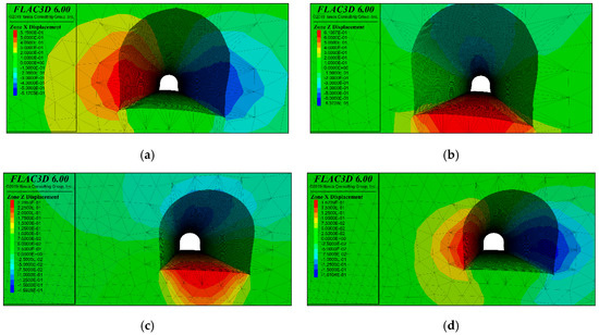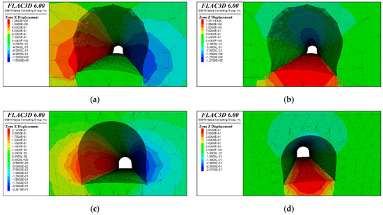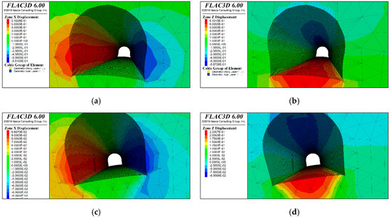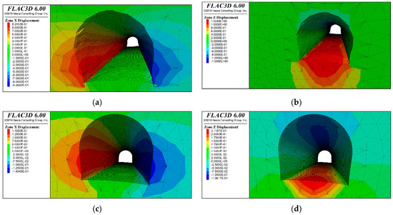 Numerical simulation of region V. (a) X−displacement without support, (b) Z−displacement without support, (c) X−displacement after support, (d) Z−displacement after support.
