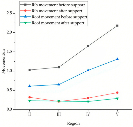 Compare the deformation obtained from the simulation of the roadways before and after support in each area obtained from the simulation, as shown in Figure 9: