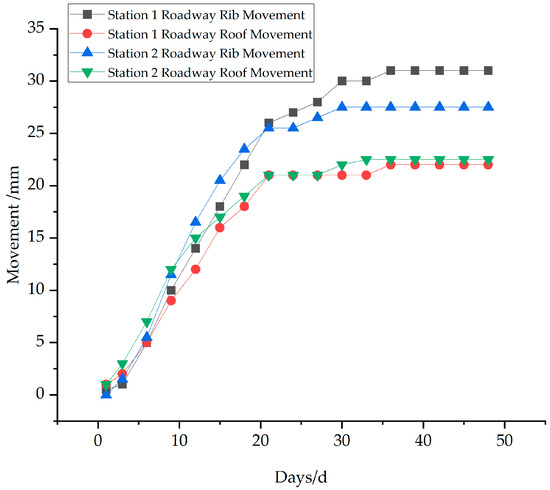 Measuring Stations 1 and 2 are arranged in area IV, the roadway section in this area is large, and the preliminary support has been completed, but the supplementary support has not been constructed yet; as shown in Figure 10 after 20 to 25 days of slow growth, the roadway surface deformation enters the creep deformation stage, and the deformation speed of the rib is larger than the roof; at present, the roadway deformation in this area is relatively small, and the full-anchor support combining the short and long cables greatly improves the range of the anchor circle and provides a large preload force. Under the high-preload active support, the development of fissures in surrounding rock is effectively controlled, the filling effect of lagging grouting on the fissures improves the stability of roadway.