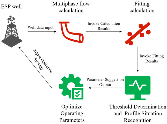 To enhance the stability of Electric Submersible Pump (ESP) systems in complex operating scenarios, flexible adjustment of operating parameters based on real-time conditions is essential [17]. Therefore, after completing the flow profile fitting, this paper constructs a set of adjustment rules based on the characteristics of the gas–liquid flow profile obtained from the fitting. This method optimizes the ESP operating state by identifying system issues through threshold-based diagnostics of key parameters and providing actionable recommendations, thereby achieving intelligent parameter optimization. The specific process is shown in Figure 6: