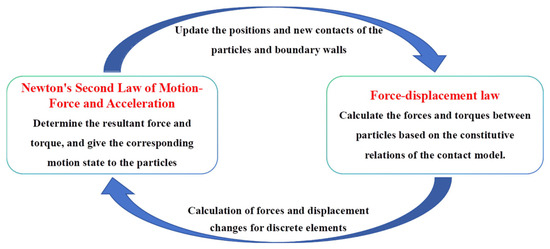The Discrete Element Particle Flow Code (PFC) operates by discretizing rock–soil into disk particles or spherical particles. Particle movement is governed by their interactions through contact with one another and is not entirely unconstrained. The principles governing particle motion are depicted in Figure 1, wherein the constitutive relationship based on the contact model uses the force–displacement law to calculate contact forces and displacement changes between particles. Subsequently, Newton’s second law of motion is used to update particle positions and identify contact points and stacking distances. These processes are iteratively refined until system equilibrium is achieved or failure occurs in the rock–soil, as illustrated in Figure 1.