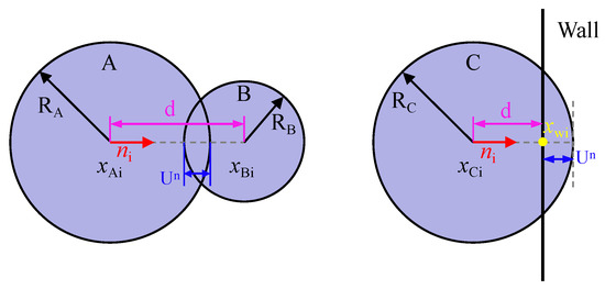 In Equation (1), xAi, xBi, and xCi represent the positions of the centers of particles A, B, and C, respectively. xWi represents the intersection point of the unit normal vector ni with the wall. d represents the distance between the centers of particles or the distance from a particle center to the wall. The formula for calculating this distance d is as follows: