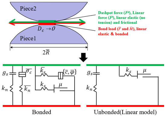 In Equation (8), represents the linear force; represents the damping force; and represents the parallel bonding force. In Equation (9), represents the parallel bonding moment. The formulae for calculating both the parallel bonding force and moment are presented as follows:
