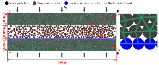 A script was written based on the particle flow code (PFC 2D) to meet the requirements of the numerical simulation. Within the numerical rock sample model, after the calibration of micro-parameters, a hydraulic fracture with specific dimensions (0.04 m in length and 0.005 m in width) was preset. Numerical proppants were then arranged inside the hydraulic fracture at a specific packing density, as depicted in Figure 4. In the Figure 4, black disks represent rock particles, brown disks represent proppant particles, blue disks signify fracture surface particles, and green lines illustrate the connections between rock particles. The surface particles of the fractures and the rock particles are classified into different groups so as to track and monitor the relative position changes in the surface particles of the fractures during the fracture closure process. A servo mechanism is used to apply the minimum horizontal principal stress to the numerical rock sample model. Subsequently, the embedding process of numerical proppants within hydraulic fractures is simulated and studied under different conditions. In conjunction with laboratory physical experiments, the accuracy of the numerical model was calibrated, systematically and comprehensively revealing the influence of proppant parameters and geostress parameters on the proppant embedment mechanism [39].