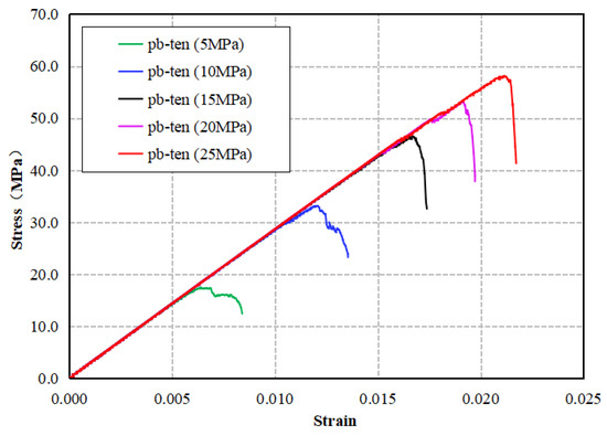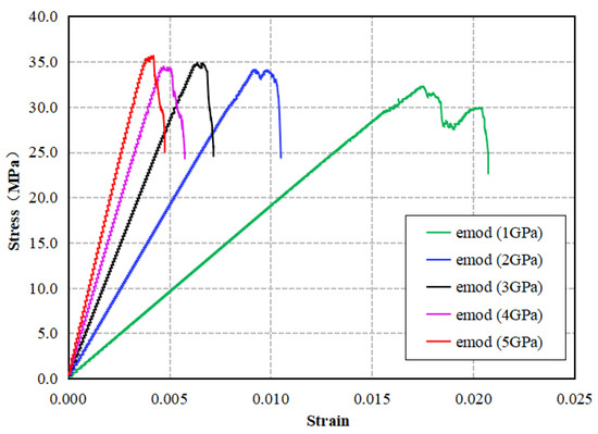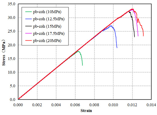 Before conducting parameter calibration, it is first necessary to discuss the influence of the main mesoscopic parameters in the model on mechanical parameters such as the compressive strength, Young’s modulus, and Poisson’s ratio of the numerical core. Based on the established numerical core model, with other parameters fixed, adjust the values of main mesoscopic parameters (including tensile strength of contact bonding pb-ten, cohesive force of contact bonding pb-coh, stiffness ratio kratio, and Effective Modulus emod), respectively, to explore the sensitivity of the mesoscopic parameters. The main microscopic parameters of the model are shown in Table 1, and the results are presented in Figure 5, Figure 6, Figure 7 and Figure 8, respectively.