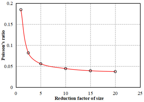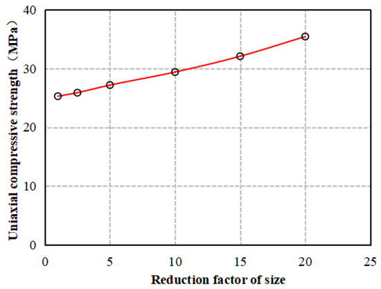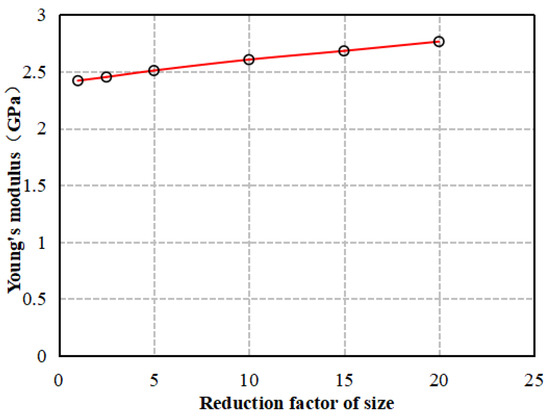 In the particle discrete element numerical simulation method, the size of the sample model has a certain impact on the test results. The base model size is 0.05 × 0.1 m, and the particle size ranges from 0.0000332 to 0.00002. Based on the model with completed parameter calibration, the sample was scaled down by 2.5 times, 5 times, 10 times, 15 times, and 20 times, respectively, and the particles were also scaled down by the same respective factors to investigate the influence of size effect on the mechanical parameters of the model. The results are shown in Figure 10, Figure 11 and Figure 12.