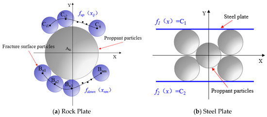 During the investigation of proppant embedment, while calculating the average fracture width provides a qualitative assessment of whether proppants are embedded in the fracture surface, it does not clarify the underlying embedment mechanisms. Therefore, this article establishes key technical methods for characterizing fracture width and embedding depth to observe changes across the entire fracture surface during the closure process under different proppant filling schemes. Figure 15a illustrates the theoretical model of rock plate embedment, while Figure 15b represents the theoretical model for steel plate simulation. In these illustrations, the blue disk symbolizes the fracture surface particles, the gray disk represents the proppant particles, and the blue straight line denotes the steel plate.