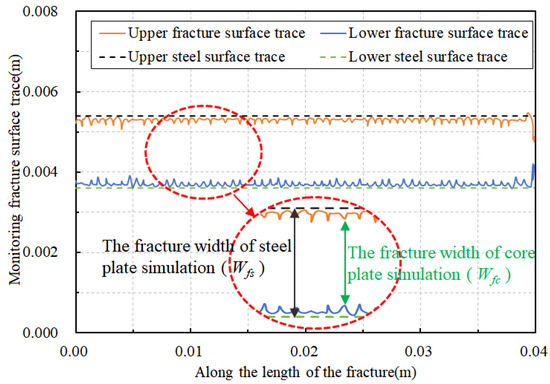 Based on this, a length of 0.04 m along the fracture direction is selected as the research object. Using a single-layer particle embedding model as an example, a PFC script file is developed to track and monitor the changes in particle positions on the fracture surface. This enables the dynamic monitoring of the fracture surface during the closure process. The functional relationships between the fracture length, propped fracture width, and embedding depth are illustrated in Figure 16 and Figure 17 below. In Figure 16, the orange curve represents the trajectory of the upper fracture surface, while the black dashed line indicates the trajectory of the upper steel plate. The blue curve depicts the lower fracture surface, and the green dashed line represents the trajectory of the lower steel plate. The difference between the orange curve and the blue curve in Figure 16 is the simulated fracture width of the core, corresponding to the purple curve in Figure 17. The difference between the black dashed line and the green dashed line in Figure 16 represents the simulated fracture width of the steel plates, corresponding to the red dashed line in Figure 17. Additionally, the difference between the red dashed line and the purple curve in Figure 17 represents the embedding depth of the proppant into the fracture surface. Subsequently, this method will be used to study the dynamic changes in fracture width and proppant embedding depth during the fracture closure process, providing a foundation for understanding the embedding mechanism of proppants.