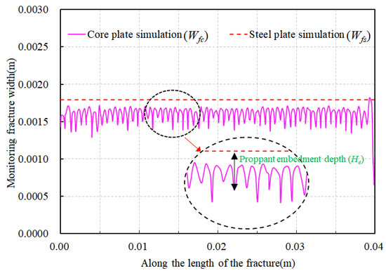 The curve of fracture width variation along the length of the fracture is shown in Figure 29. The fracture width obtained from steel plate fracturing monitoring is consistently higher than that measured through rock plate simulations, indicating that proppants still embed into the fracture surfaces during the fracture closure process, thereby affecting the fracture width. Under constant conditions, as closure stress increases, the propped fracture width gradually decreases. However, the differences in fracture width across various plans are not particularly pronounced. Therefore, it is essential to analyze the difference in monitored fracture widths between steel and rock plates to study the impact of proppant embedment on fracture width.