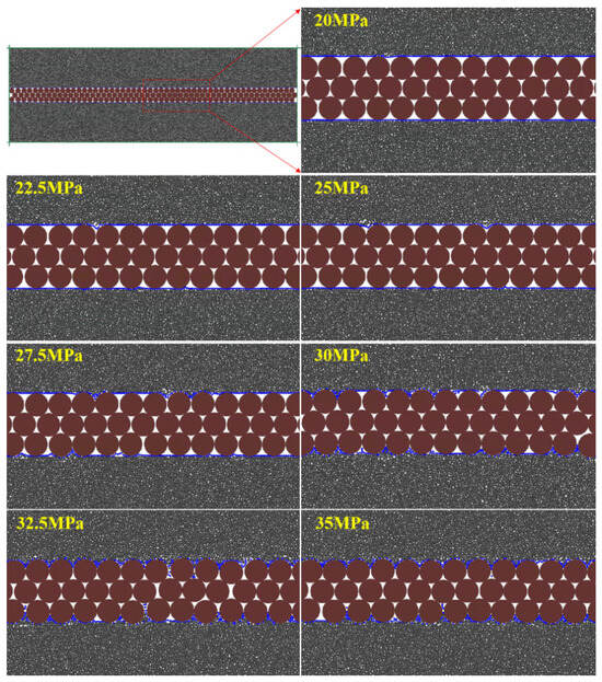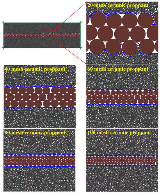 A total of 220 proppant particles (20–40 mesh) were placed in a 0.04 mm long fracture, achieving a proppant concentration of approximately 3 kg/m2. Using a script to create a FISH function, the placement of the proppants and the changes in fracture width during the closure process were monitored under closure stresses of 15 MPa, 20 MPa, 25 MPa, 30 MPa, and 35 MPa, respectively. The conditions were simulated for both steel and rock plates, and the average fracture width under different conditions was calculated.