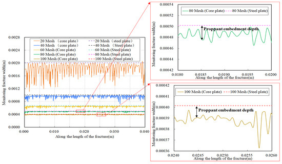 Figure 20 shows the curve of propped fracture width variation along the propped fracture length direction. Under the same conditions, as the mesh size of the proppant increases and the particle size decreases, the propped fracture width gradually decreases. Additionally, the overall propped fracture width measured by the steel plate fracture monitoring is higher than that obtained from the rock plate simulations, indicating that during the fracture closure process, the proppant still embeds into the fracture surfaces, affecting the propped fracture width. Furthermore, it can be observed that as the proppant particle size decreases, the degree of fluctuation in propped fracture width also diminishes. This is primarily because smaller particle sizes result in a greater number of proppants arranged per unit length of the propped fracture. During the fracture closure process, this leads to an increased number of contact points between the proppants and the fracture surface. Under the same closure pressure, the interaction force between a single proppant and the fracture surface is reduced, thereby resulting in a decreased degree of fluctuation in propped fracture width along the length of the propped fracture.