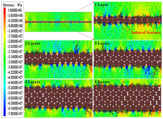 From the stress distribution map shown in Figure 22 after fracture closure, it can be observed that the areas where the proppant contacts the fracture surfaces primarily experience compressive stress (blue regions), while the contact gap areas are mainly subjected to tensile stress (red regions). In the comparison of stress distribution diagrams for 20-mesh ceramic proppant with different layer counts, the SCF in the region of maximum compressive stress concentration is approximately 23.9 for single-layer proppant, 19.63 for two layers, 18.63 for three layers, 16.5 for four layers, and 15.5 for five layers. The greater the number of proppant layers, the smaller the stress concentration factor in the maximum compressive stress concentration area. Combining with the proppant embedment model in Figure 23, it can be clearly seen that under all schemes, the fracture surfaces have a certain degree of undulation. Next, further analysis will be carried out by integrating the force chain diagrams and fracture width monitoring curves.