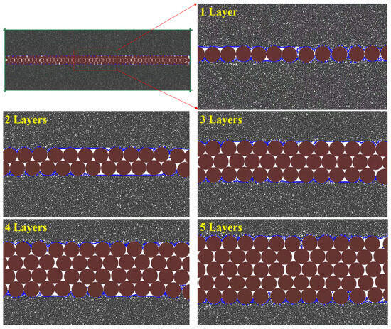 The number of proppant layers has a significant effect on the propped fracture width, and it also greatly influences the embedment depth. To investigate how the number of proppant layers affects their embedment into the fracture surfaces, numerical simulation models for 20-mesh proppants were established for single-layer, double-layer, triple-layer, quadruple-layer, and quintuple-layer arrangements based on preliminary modeling. The study analyzes the variations in propped fracture width and embedment depth under different plans. The simulation results are illustrated in the figures below.