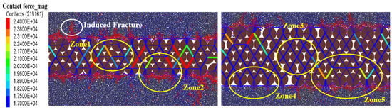 Figure 24 illustrates the force chain diagrams of three-layer and five-layer proppants after fracture closure. In the force chain analysis diagram, the color of the force chain represents the specific value of the force chain. The closer the force chain is to red, the larger the force chain value; the closer it is to blue, the smaller the force chain value. In Figure 24, the force chain values between proppants in Region 1 range from approximately 1559.28 N to 23,843.4 N, in Region 2 from approximately 4768.95 N to 26,241.6 N, in Region 3 from approximately 1543.12 N to 18,071.9 N, in Region 4 from approximately 1441.54 N to 15,300.1 N, and in Region 5 from approximately 1566.42 N to 22,823.7 N. A comparison between the force chain diagrams in Region 1 and Region 3 reveals that the particles in the three-layer proppant arrangement experience greater contact forces due to being compressed by surrounding particles compared to those in the five-layer arrangement. With the same particle size, both arrangements contact the fracture surface with the same number of proppants; however, the greater number of proppant layers in the five-layer arrangement leads to some degree of force cancelation from the closing stress within that structure. By comparing the stress distributions and force chain diagrams in Region 2 and Region 4, it can be clearly seen that the proppant particles close to the fracture surface bear greater compressive force from the internal proppant particles. Furthermore, by comparing the embedment models in Region 4 and Region 5, it can be found that in regions with larger contact forces, the undulation degree of the fracture surface is greater.