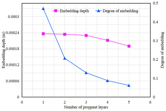 The average embedment depth and embedment degree are illustrated in Figure 26. Under constant conditions, as the number of proppant layers increases, the propped fracture width also increases; however, the overall embedment depth and degree of embedment show a decreasing trend. This indicates that a greater number of proppant layers makes it more difficult for the proppants to embed into the fracture surfaces, while fewer layers allow for easier embedment. Additionally, the rate of decrease in embedment depth slows down as the number of layers increases, while the rate of decrease in embedment degree accelerates.