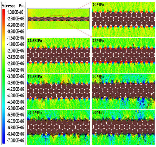 Figure 27 and Figure 28 depict the stress distribution and embedment models under varying closure stresses. In the comparison of stress distribution diagrams under different closure stresses, the SCF in the region of maximum compressive stress concentration is approximately 14.81 at a closure stress of 20 MPa, 15.15 at 22.5 MPa, 15.94 at 25 MPa, 16.68 at 27.5 MPa, 18.63 at 30 MPa, 19.75 at 32.5 MPa, and 21.00 at 35 MPa. It can be observed that under the same conditions of proppant particle size and layer number, higher closure stress will lead to more concentrated compressive stress and tensile stress at the contact points and contact gaps between the proppant and the fracture surface, and the undulation degree of the fracture surface will be more significant. In contrast, lower closure stress will result in a less significant undulation degree of the fracture surface.