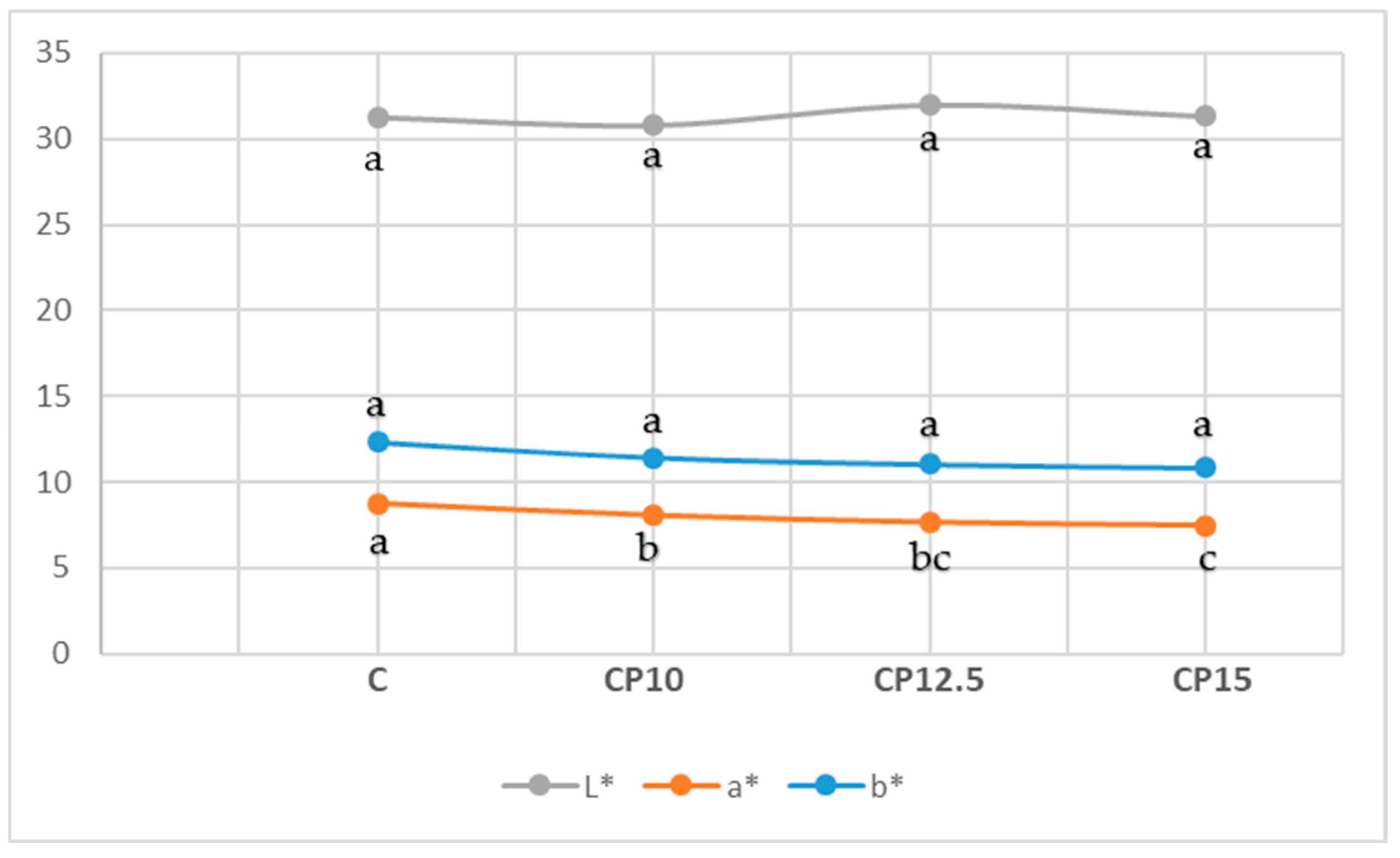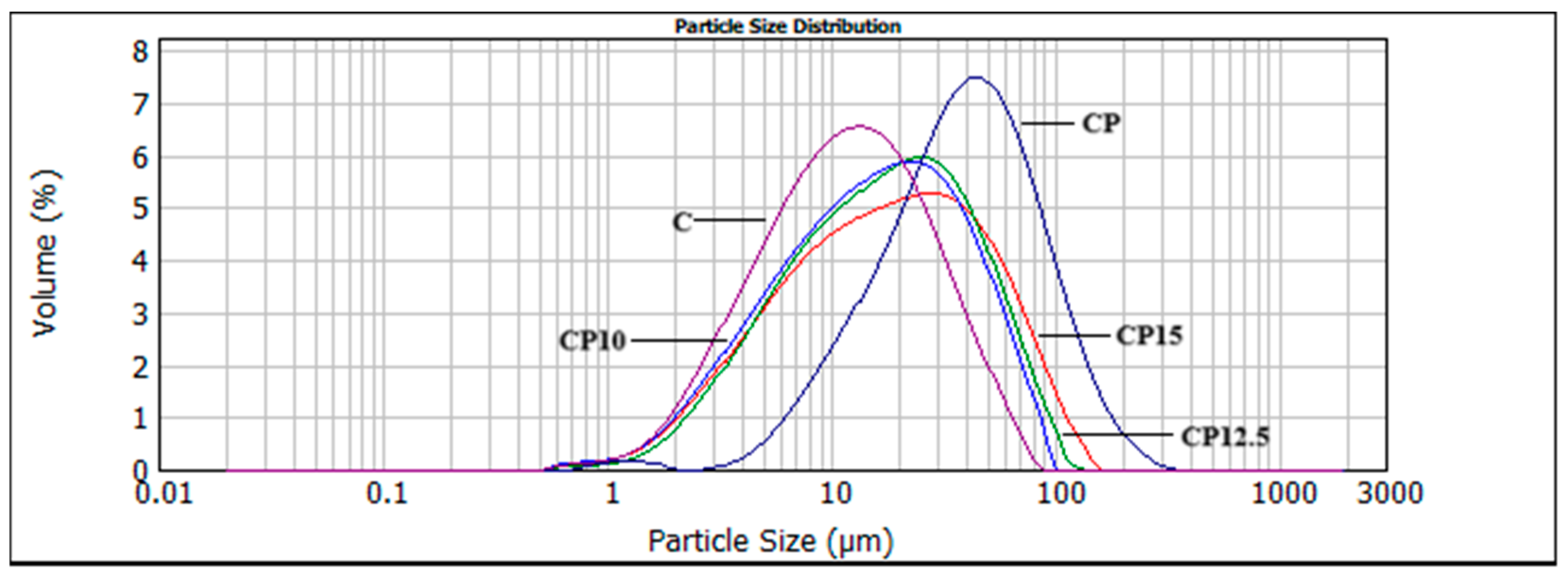 CP12.5 | 12.83 ± 0.14 c | 28.53 ± 0.16 c | 48.52 ± 0.01 c | 6.78 ± 0.60 c | 1.23 ± 0.01 c | 2.11 ± 0.04 c | 2152.80 ± 1.75 c |
