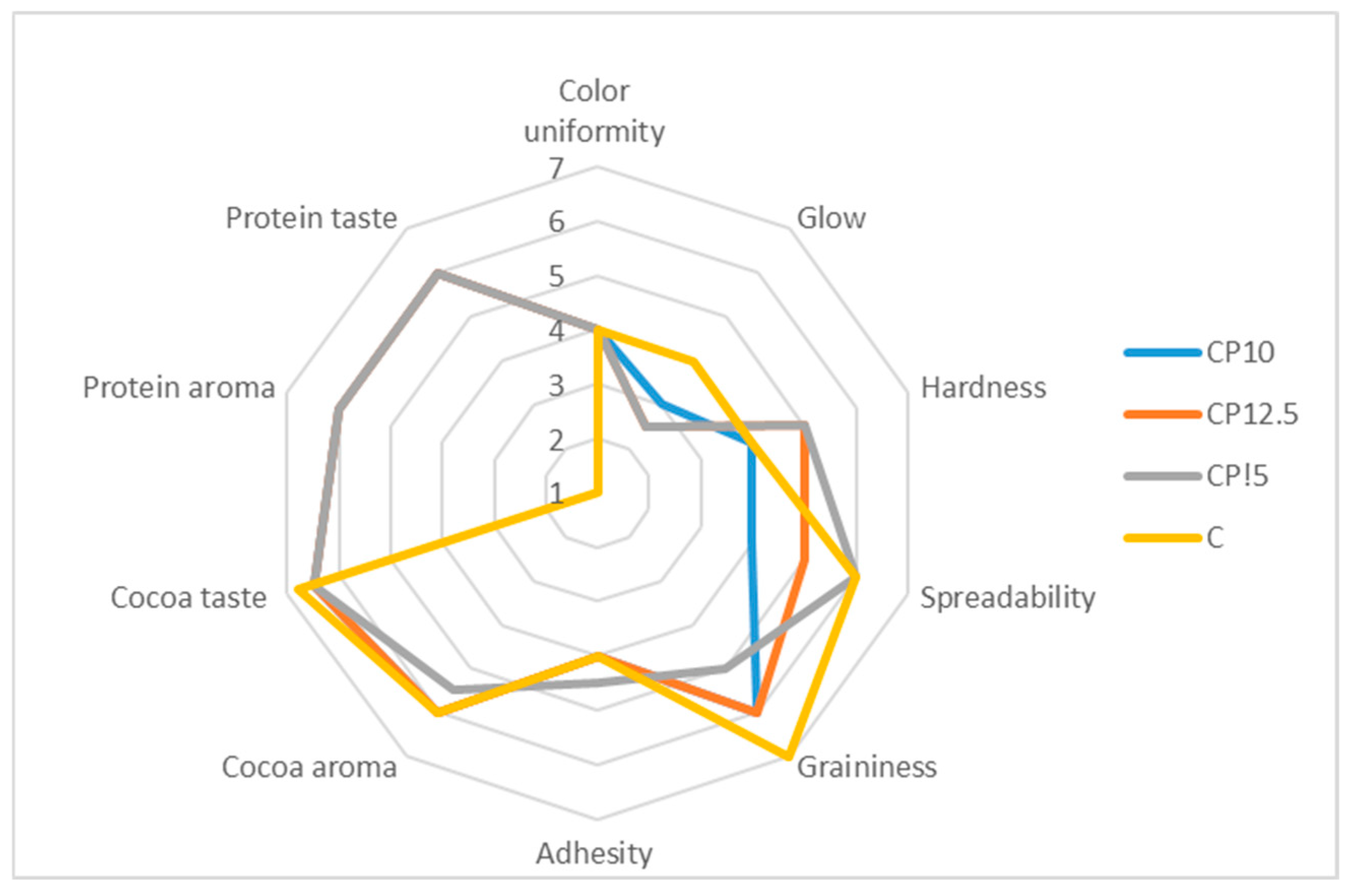 - Kumar, P. Process optimization for the preparation of chocolate spread incorporating whey protein concen-trate, cocoa powder, olive oil, and butterfat using response surface methodology. J. Food Process. Preserv. 2015, 39, 745–757. [Google Scholar] [CrossRef]