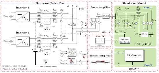 Figure 1 describes the AC microgrid under study, which consists of two parallel three-phase grid-following inverters connected to the utility grid through LCL filters at the point of common coupling (PCC). The test bench consists of two sections, hardware and software. The first one involves the hardware under test and three blocks for the interconnection process. The other section consists of two simulation model blocks, the Utility-Grid model and the SS_Control block. The hardware consists of the following elements: (1) Imperix PEB8024 power (Imperix ltd., Sion, Switzerland) electronics modules to build the two inverters, (2) a set of breakers for the interconnection process, with , and (3) a DC power source 62050H-600 (Chroma ATE Inc., Taoyuan, Taiwan) to provide and . The DC voltage represents a renewable source provided by a photovoltaic system, and the DC voltage is considered to be a battery energy storage system. The operation of the inverters in grid-following mode requires the following analog signals: three voltages and six currents sensed by the Imperix DIN-800V and DIN-50A modules (Imperix ltd., Sion, Switzerland), respectively; and two voltages measured by the sensors hosted in the PEB8024 modules driven by fiber-optic signals, where and . The Interface (Imperix) block is designed to receive analog signals from sensors. This interface can handle up to 16 analog inputs and 16 digital input/output channels. The OP8110 (OPAL-RT Technologies, Inc., Montreal, Quebec, Canada) power amplifier is used to interconnect power signals between the HUT and the real-time simulated model of the utility grid. The Host PC block is used to prepare the interconnection process. The simulation model section is in the RTS OP4510 (OPAL-RT Technologies, Inc., Montreal, Quebec, Canada). The real-time simulated model of the utility grid is hosted in Core 1, and the control system for power electronic devices (SS_Control) in Core 2.