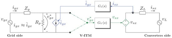 The AC microgrid setup includes physical and simulation components. Figure 2 describes a simplified version of the system to address the modeling of the test bench and the V-ITM. The schematic shows only one phase of the system, and the HUT is reduced to an equivalent Thévenin model. The voltage source and the impedance represent the equivalent electric circuit of the utility grid, defined by specific and values. This representation is suitable for stability analysis, which is required to establish the operating limits of the AC microgrid. The resistance is the element where the voltage is sensed, which is the setpoint to be reproduced by the OP8110 power amplifier. The value of is sufficiently high that its current can be considered zero. Because of this, the current , supplied by the grid, slightly deviates from the feedback current . Additionally, a feedback current filter is added to the feedback loop to preserve the stability of the whole system, given by