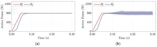 Active power behavior for a specific operating condition and parametric variations in the control system of the power electronic devices. (a) Nominal control system parameters. (b) Variation in one of the control system parameters.