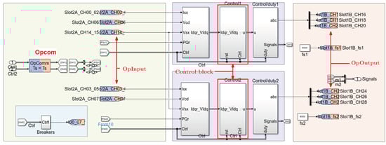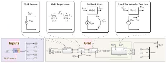 Figure 7 shows the V-ITM and the utility grid model divided into two sections: Inputs and Grid, respectively. PCC voltage settings are enabled by gathering the host PC inputs asynchronously. The OpComm block serves as a real-time communication link and is dedicated to processing the inputs of each subsystem in the model before they are used in the real-time simulation.