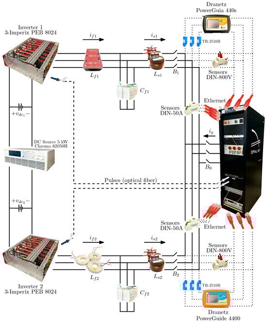 This section is dedicated to analyzing the performance of the AC microgrid in a PHIL simulation in an experimental setup for different operating conditions. For the experimental setup shown in Figure 9, the rated output power of each grid-following inverter is for , its DC bus is configured as a constant voltage of , and the nominal voltage of the PCC is line to line. The parameters are described in Table 1.