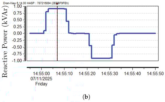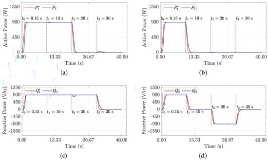 where and are the unfiltered active and reactive powers, , , and with . As observed in Subplots Figure 10a,b, both inverters accurately track the active power references throughout the experimental test. The steady-state error is minimal, and the transient response is smooth with minimal overshoot, showing smooth transitions. The system reaches and maintains the desired power levels throughout all operating points, demonstrating the effectiveness of the control-system tuning.