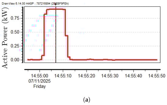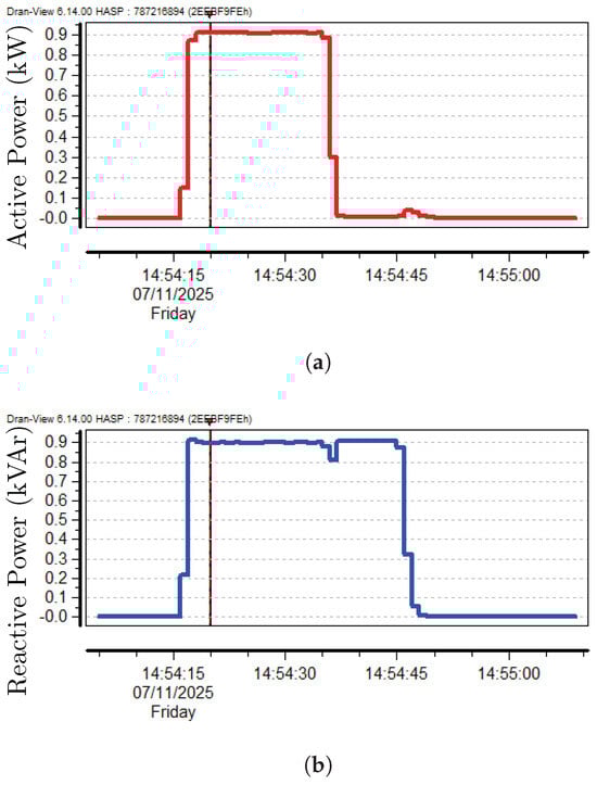 Overall, the results confirm that a feedback current filter tuned to a cutoff frequency of , and a stiff grid configured with an SCR of 20, ensures a precise and stable operation of the PHIL simulation in the experimental AC microgrid setup for both active and reactive power regulation under varying profiles. To validate the performance of the PHIL simulation in the experimental AC microgrid setup under actual conditions, measurements were taken using two power quality instruments from the brand DRANETZ and the visualization tool Dran-View 6. The results are shown in Figure 11, Figure 12, Figure 13, and Figure 14, respectively. Subplots Figure 11a and Figure 13a show the measured active power responses and for the two inverters, respectively. As expected, the measured power closely tracks the expected behavior, reaching the peak value of approximately 0.9 kW and returning to values close to zero after the reference step is removed.