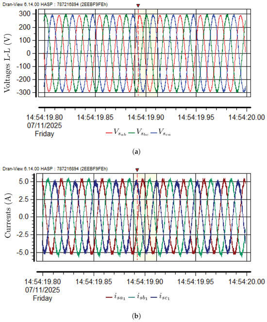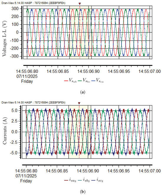 Subplots Figure 12a and Figure 14a display the three-phase voltage waveforms at specific times during the experiment. These signals maintain sinusoidal profiles and balanced magnitudes, confirming operation at the rated voltage under the demanded power profiles. In addition, Subplots Figure 12b and Figure 14b show the currents at the PCC for each inverter, respectively, verifying the sinusoidal nature of these quantities. Such results validate the measurements presented in Figure 10 when implemented in the real-time simulated model.