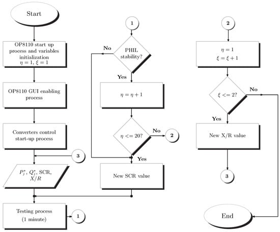 After selecting the V-ITM method, a flexible model is designed to determine the appropriate value of . The utility grid model is also adapted to vary the SCR from 1 to 20, considering the entire operating range. For this purpose, a set of twelve series utility-grid impedance is added to test different SCR values. In this way, only one impedance is connected and the others are short-circuited closing their parallel switches, as shown in the block “Grid Impedance” in Figure 7.