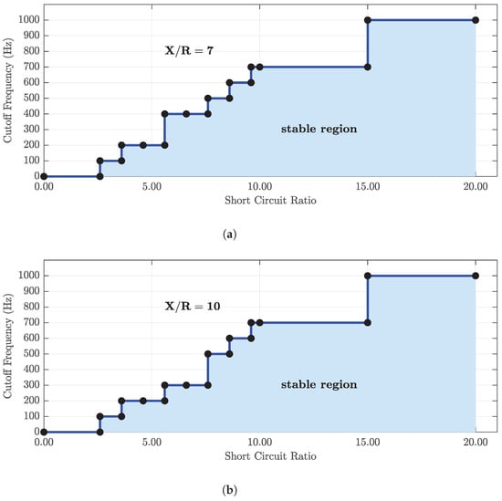 Stability region of the PHIL experiment for two different X/R ratios. (a) X/R = 7, (b) X/R = 10.