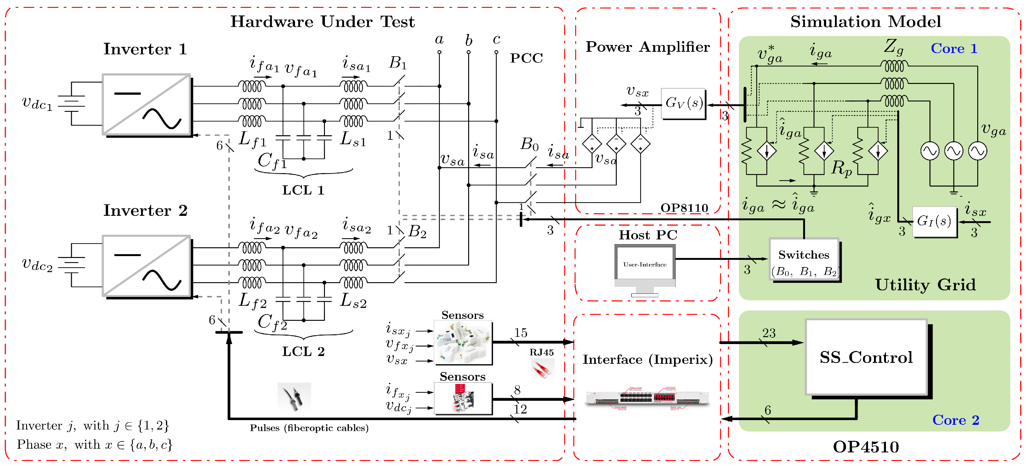 Figure 1 describes the AC microgrid under study, which consists of two parallel three-phase grid-following inverters connected to the utility grid through LCL filters at the point of common coupling (PCC). The test bench consists of two sections, hardware and software. The first one involves the hardware under test and three blocks for the interconnection process. The other section consists of two simulation model blocks, the Utility-Grid model and the SS_Control block. The hardware consists of the following elements: (1) Imperix PEB8024 power (Imperix ltd., Sion, Switzerland) electronics modules to build the two inverters, (2) a set of breakers