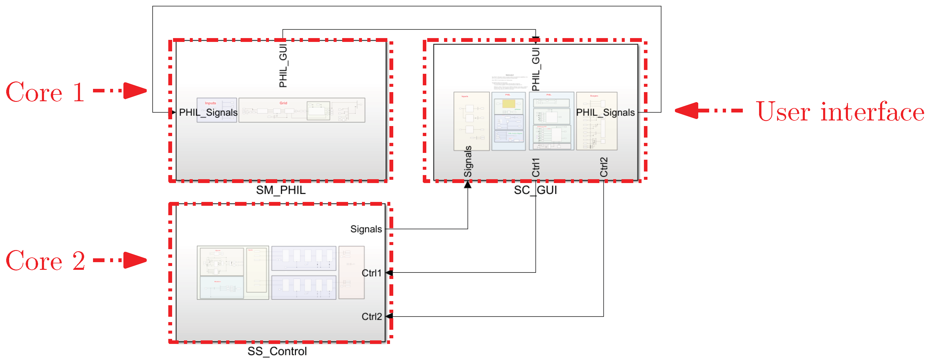 . The Interface (Imperix) block is designed to receive analog signals from sensors. This interface can handle up to 16 analog inputs and 16 digital input/output channels. The OP8110 (OPAL-RT Technologies, Inc., Montreal, Quebec, Canada) power amplifier is used to interconnect power signals between the HUT and the real-time simulated model of the utility grid. The Host PC block is used to prepare the interconnection process. The simulation model section is in the RTS OP4510 (OPAL-RT Technologies, Inc., Montreal, Quebec, Canada). The real-time simulated model of the utility grid is hosted in Core 1, and the control system for power electronic devices (SS_Control) in Core 2.