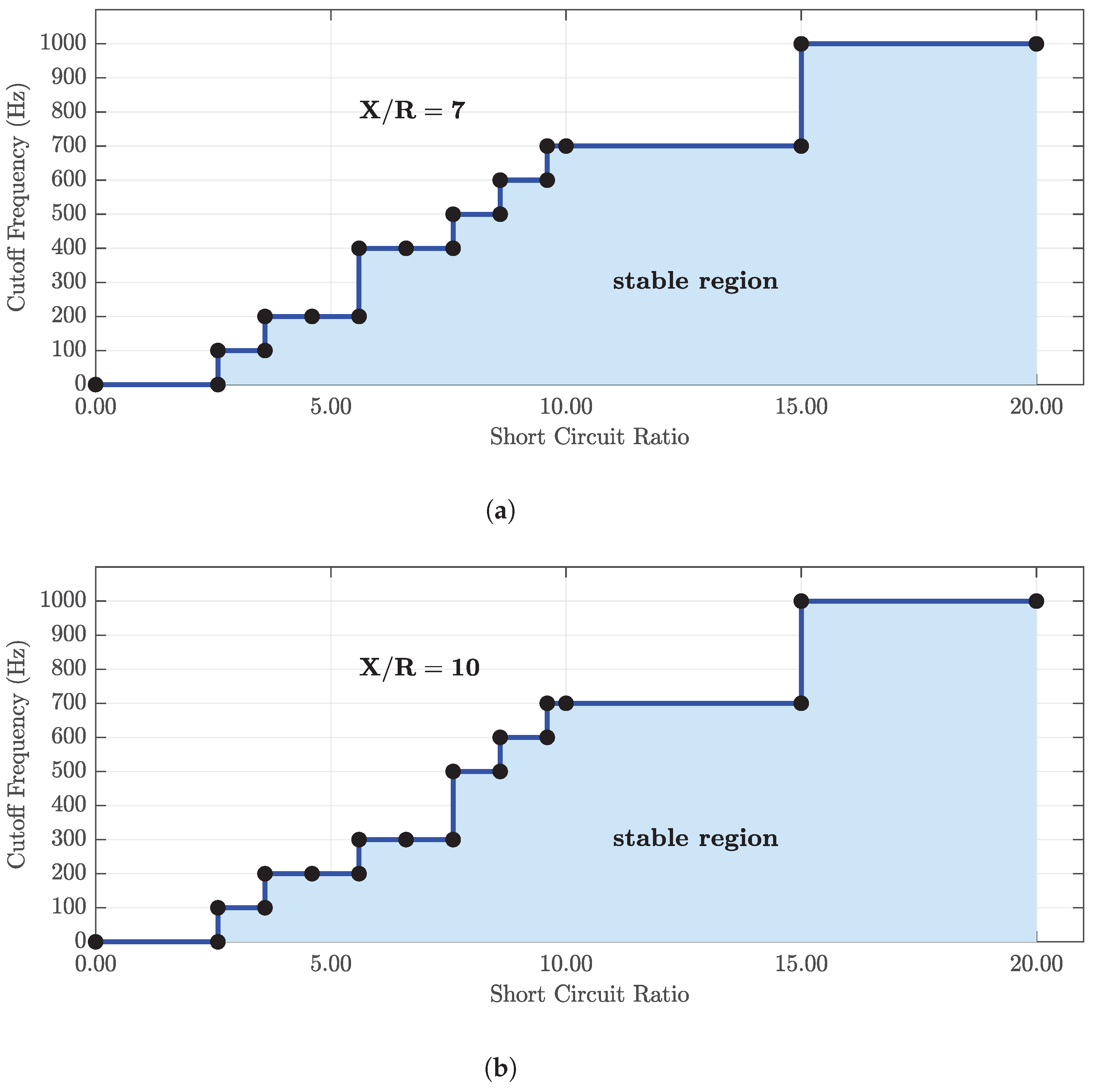 In Experiment 2, the stability boundaries reveal a strong dependence on the feedback-current-filter cutoff frequency and the short-circuit ratio of the equivalent electric circuit of the utility grid. For low values, the system preserves stability only at relatively low cutoff frequencies, whereas higher values allow for broader bandwidths without compromising stability. This behavior aligns with expectations from the literature, since weak grids exacerbate the equivalent impedance of the utility grid, requiring ratios above unity and therefore imposing tighter control bandwidth limitations. Even in the presence of uncertainty in the impedance value of , a relevant observation is that the lower the grid impedance, the higher the value of should be. Within the scope of this work, the calculation of this parameter is not addressed; instead, a practical stability margin analysis is performed. The observed difference between ratios of 7 and 10 further confirms that inductive grids impose stricter stability constraints, which should be carefully considered during the design stage.