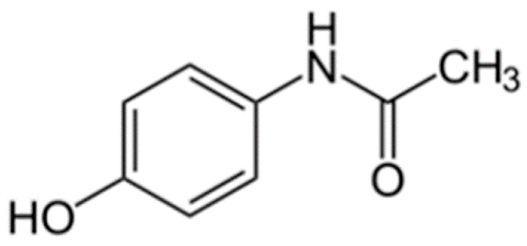Pharmaceutical contaminants, such as paracetamol (acetaminophen), have emerged as pollutants of growing concern due to their frequent detection across all environmental compartments including air, water, and soil and particularly in surface waters and wastewater systems worldwide [1,2,3]. Responsible management and disposal of pharmaceutical wastewater are essential to minimize chemical pollution, as the uncontrolled release of hazardous substances can lead to significant environmental degradation [4]. Acetaminophen, (as shown in Figure 1), is a widely used analgesic and antipyretic commonly prescribed for the symptomatic relief of mild to moderate pain [5]. Its therapeutic applications include the treatment of sore throat, menstrual pain, post-vaccination discomfort, and pain associated with various medical procedures [6]. However, paracetamol enters aquatic environments primarily through human excretion, improper disposal, and discharges from pharmaceutical industries, hospitals, and municipal sources [7,8]. Although typically found at trace concentrations, these substances can pose ecotoxicological risks to aquatic organisms, even at low levels of exposure [9].