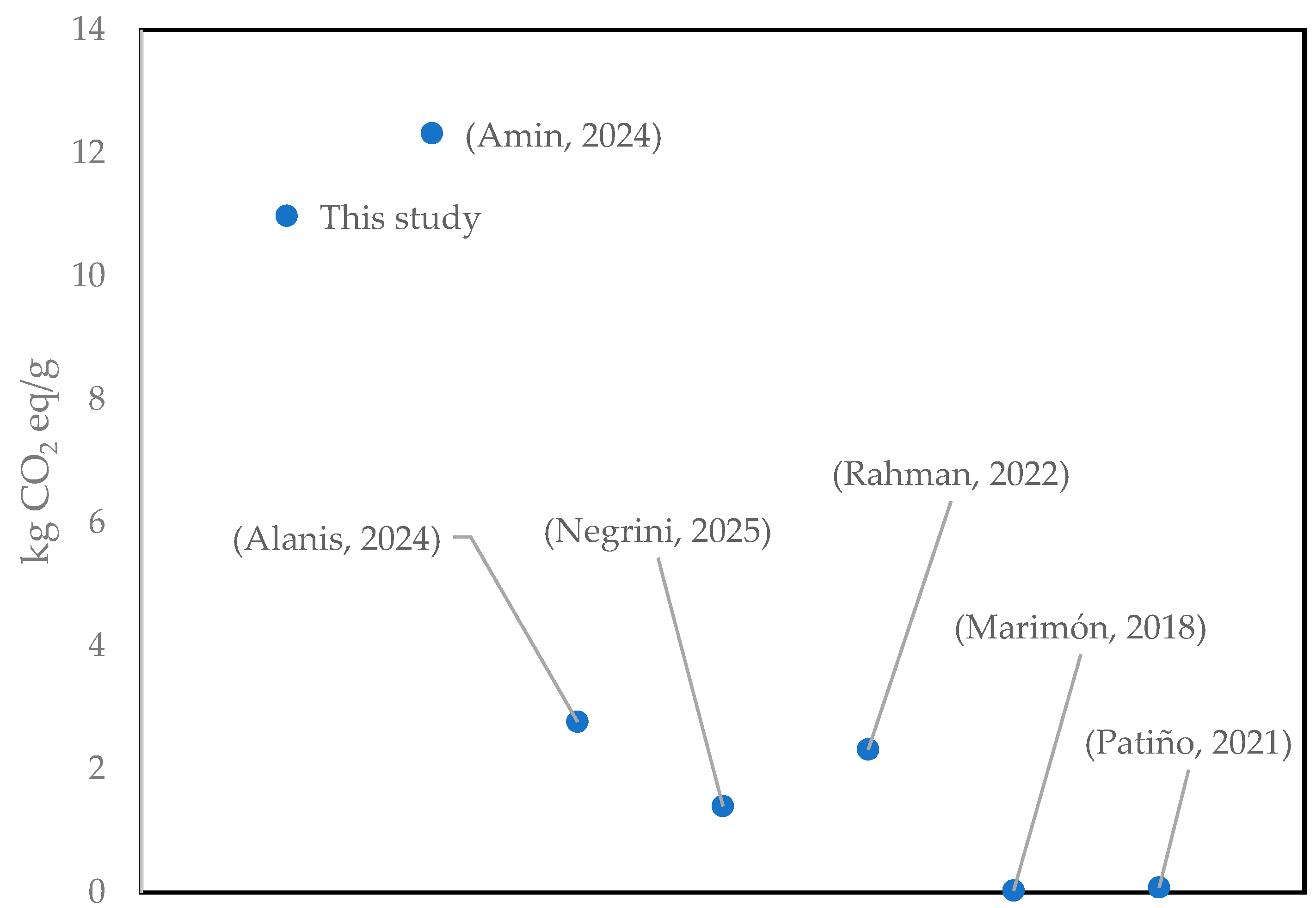 The GWP values obtained in this study were compared with those reported in other works related to the synthesis of copper or iron-based catalysts [63,64,65,66,67,68] (see Figure 3). It is worth emphasizing that the literature on this topic is rather scarce, and this work is the first effort to assess the environmental burdens of Cu/Fe PILC catalyst synthesis. Thus, data in Figure 3 must be analyzed with caution since they are not the same catalyst. In addition, other differences limiting a straightforward comparison are quality of data for the corresponding life cycle inventory. It also must be noted that source manuscripts for data in Figure 3, use different function units (FU) and therefore additional calculations were conducted to report data in the same FU (1 g) than this work.