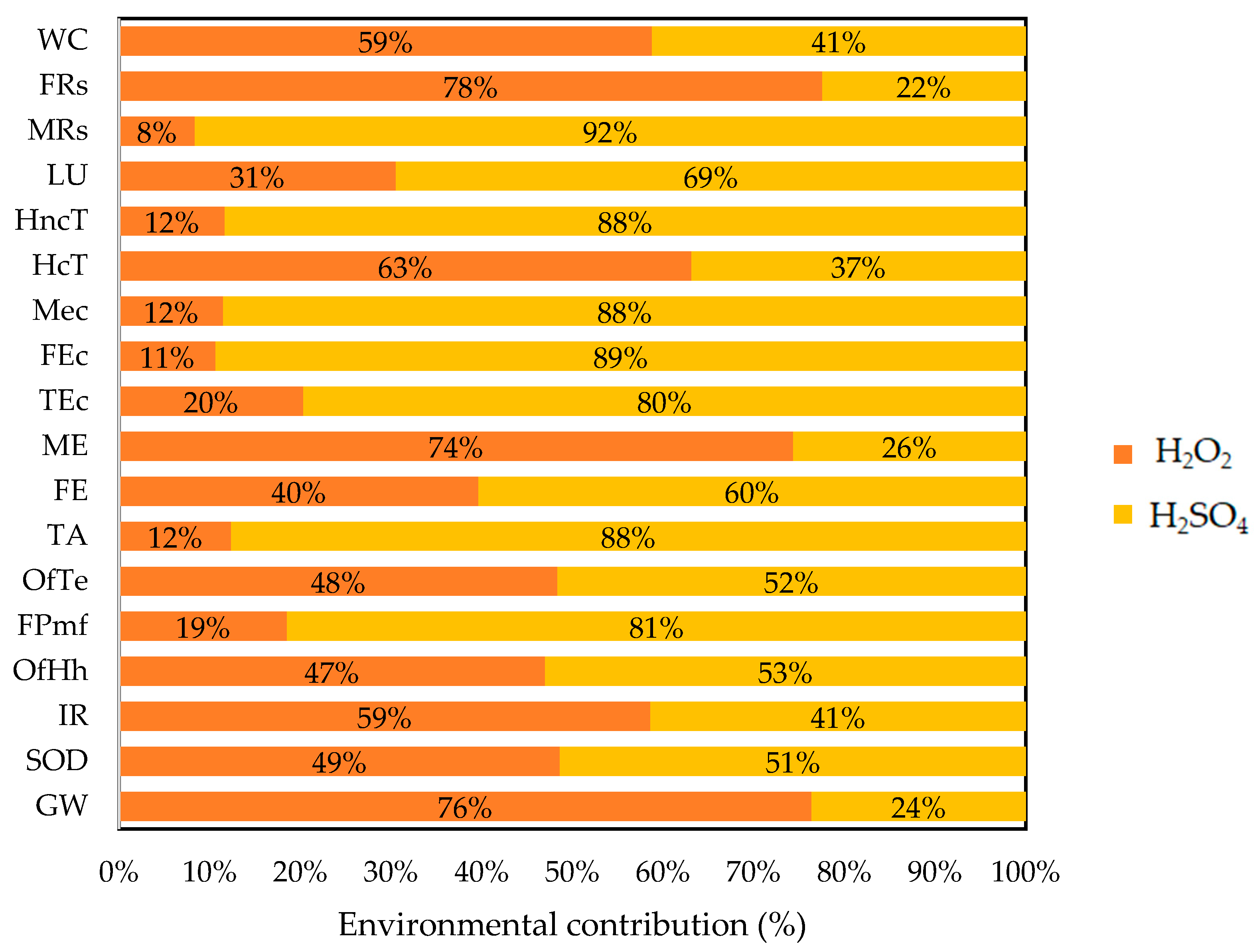 In the context of Fenton process, production of chemicals has been regarded as the second-most cited contributor to the environmental footprint of the process [43]. Thus, the input of any chemical to the process will importantly contribute to its environmental footprint. For this work, Figure 5 depicts the contribution percentage to mid-point level environmental categories, of hydrogen peroxide and sulfuric acid addition to the photo-Fenton process. Contrary to that reported by [43], it can be observed in Figure 5 that H2O2 is not the main contributor to all environmental impacts, while H2SO4 impacts most of them. From the eighteen assessed environmental categories, there are only six where the hydrogen peroxide is the main contributor, i.e., WC, FRs, HcT, ME, IR and GW. The relative high contribution to most of these categories can be ascribed to the reported high energy consumption by H2O2 production (1200 kWh·kg−1 of H2O2). Regarding HcT, this category might be highly impacted since H2O2 production involves anthraquinone and a mix of alkyl-aromatic solvents [88]. It is worth noticing that the environmental footprint of chemical addition is not only due to its production but is also related to the amount added. In this sense, it is important to notice that the H2O2 concentration used in each Fenton process varies and it is usually one or two orders of magnitude higher than the stoichiometrically required. The process analyzed in this work was added only with the stoichiometric amount, i.e., 0.483 g, and this might also be the reason for H2O2 not being the main environmental footprint contributor as in other Fenton-related works [43].