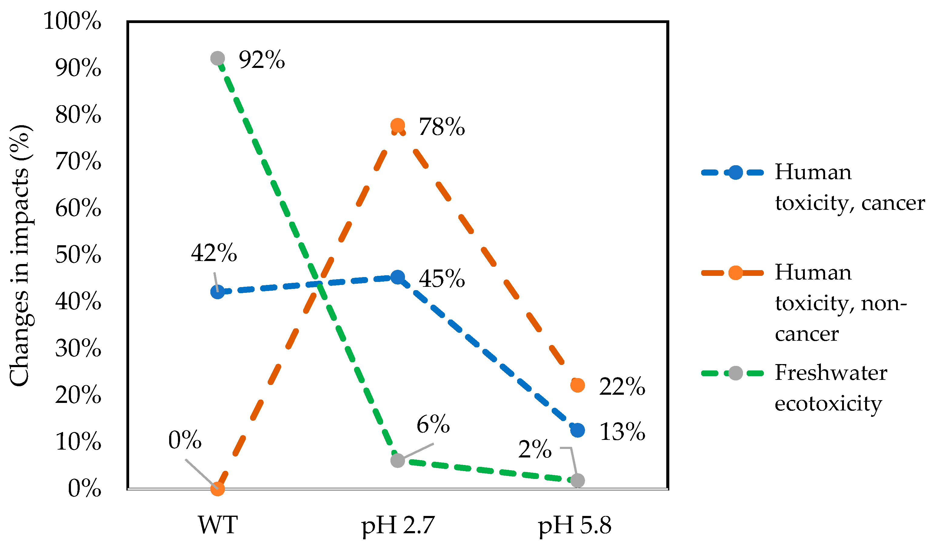 Regarding the environmental category human toxicity, cancer; there were included all final emissions, carcinogenesis-related impacts and it can be observed in Figure 6 that the contribution to this category decreased from 45% to ca. 13%, with the photo-Fenton treatment conducted at pH of 5.8.