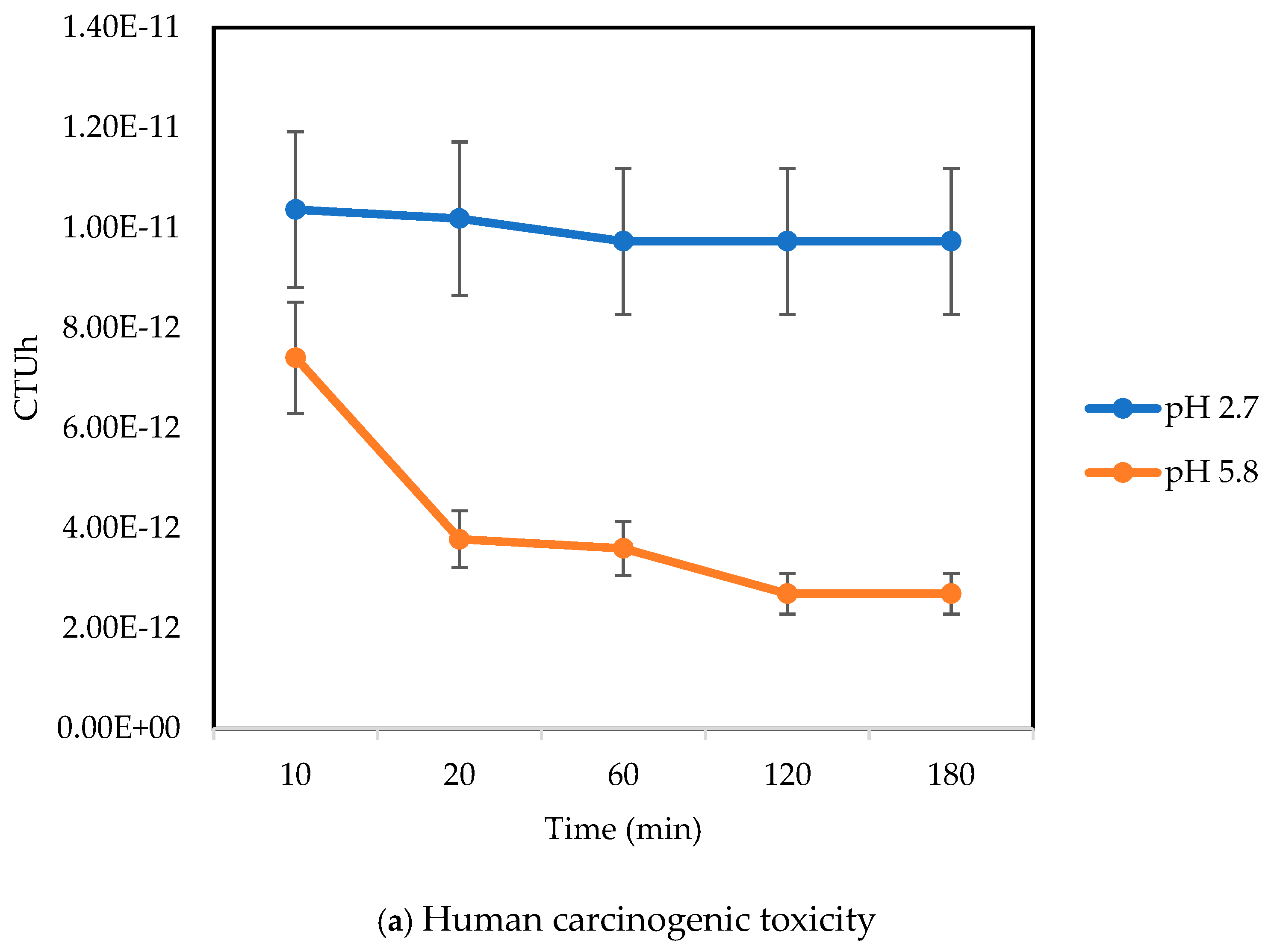 The effect of treatment time (10, 20, 60, 120 and 180 min) was assessed on the long-term impact categories of the paracetamol degradation by photo-Fenton Cu/Fe PILC at both pH, 2.7 and 5.8. Error bars corresponding to a 15 % uncertainty were included to reflect variability in the measurements and to provide a more robust interpretation of results. In Figure 7a, it is observed that the impact category of HcT, at a pH of 5.7 and 180 min, is 2.69 × 10−12 cases, while at pH 2.7 at 60 min, the value no longer changes from 9.73 × 10−12 cases. In Figure 7b, the HncT impact category, at pH 2.7, does not change (1.29 × 10−13 cases), as well as at pH 5.8, 3.67–14 cases remain constant, being a non-sensitive category. In Figure 7c, the FEc impact category, at pH 2.7, the value no longer changes from minute 60, 5.70 × 10−4 PAF·m3·day; while at pH 5.8, the impact finds a minimum at 120 min of treatment, 1.67 × 10−4 PAF·m3·day, which is about 3 times lower than that observed for the process conducted at acid pH. The observed trend for circumneutral pH can be ascribed to paracetamol removal and hydrogen peroxide consumption rate, both being faster in the process conducted at acid pH. Nevertheless, the low value observed after 120 min of treatment can be ascribed to the fact of sulfuric acid not being added to the process and therefore not being an output, as well as achieving similar paracetamol and TOC outputs than the process at a pH = 2.7.
