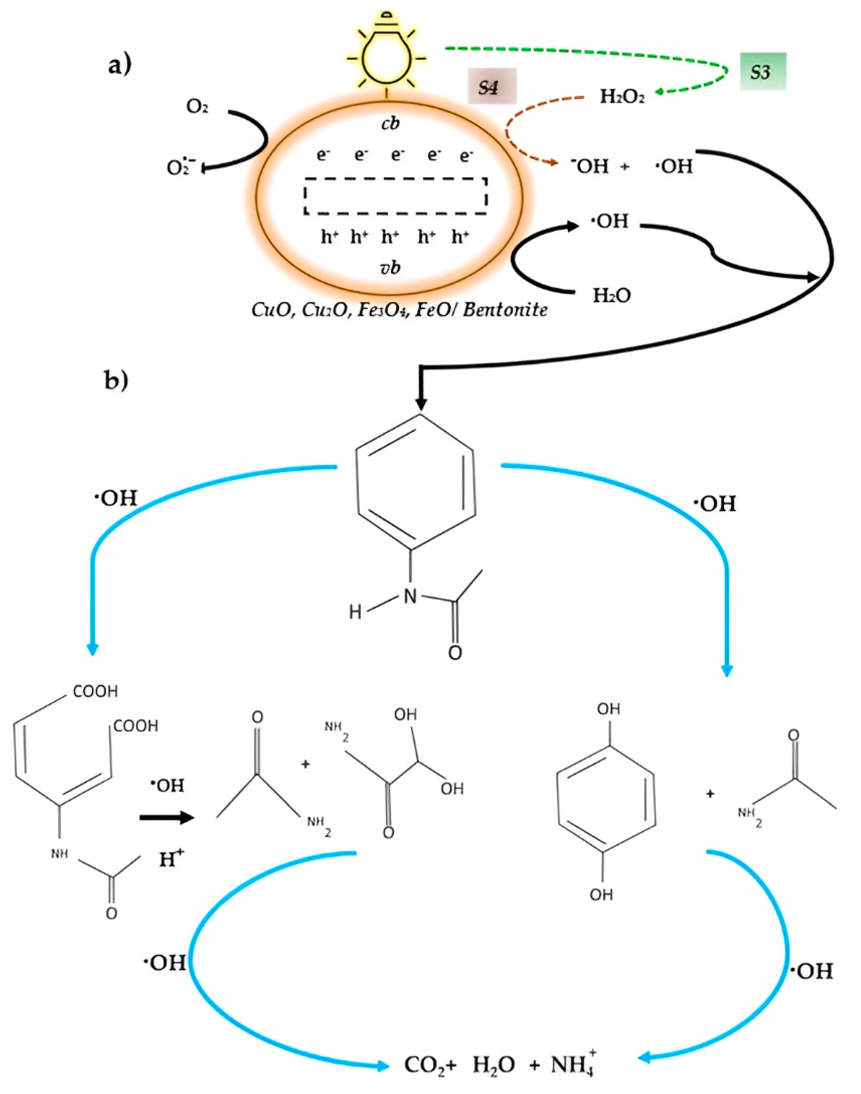 Currently, various methods have been applied for paracetamol degradation, including physical processes such as forward osmosis (FO), which utilizes a wide range of specialized membranes [12,13]. This technology is considered a promising paracetamol removal technology, as it presents an environmentally friendly, energy-efficient, and economically viable alternative. Biological methods have also been used to degrade paracetamol, mainly through microbial degradation processes using bacteria or enzymes [14]. Advanced oxidation processes have been widely used for the degradation of paracetamol and its intermediates, including photolysis [15], Fenton process [16], electro-Fenton (electricity) [17], photo-Fenton (UV light) [18], sono-Fenton (ultrasound) [19,20], and heterogeneous photocatalysis [21,22,23].