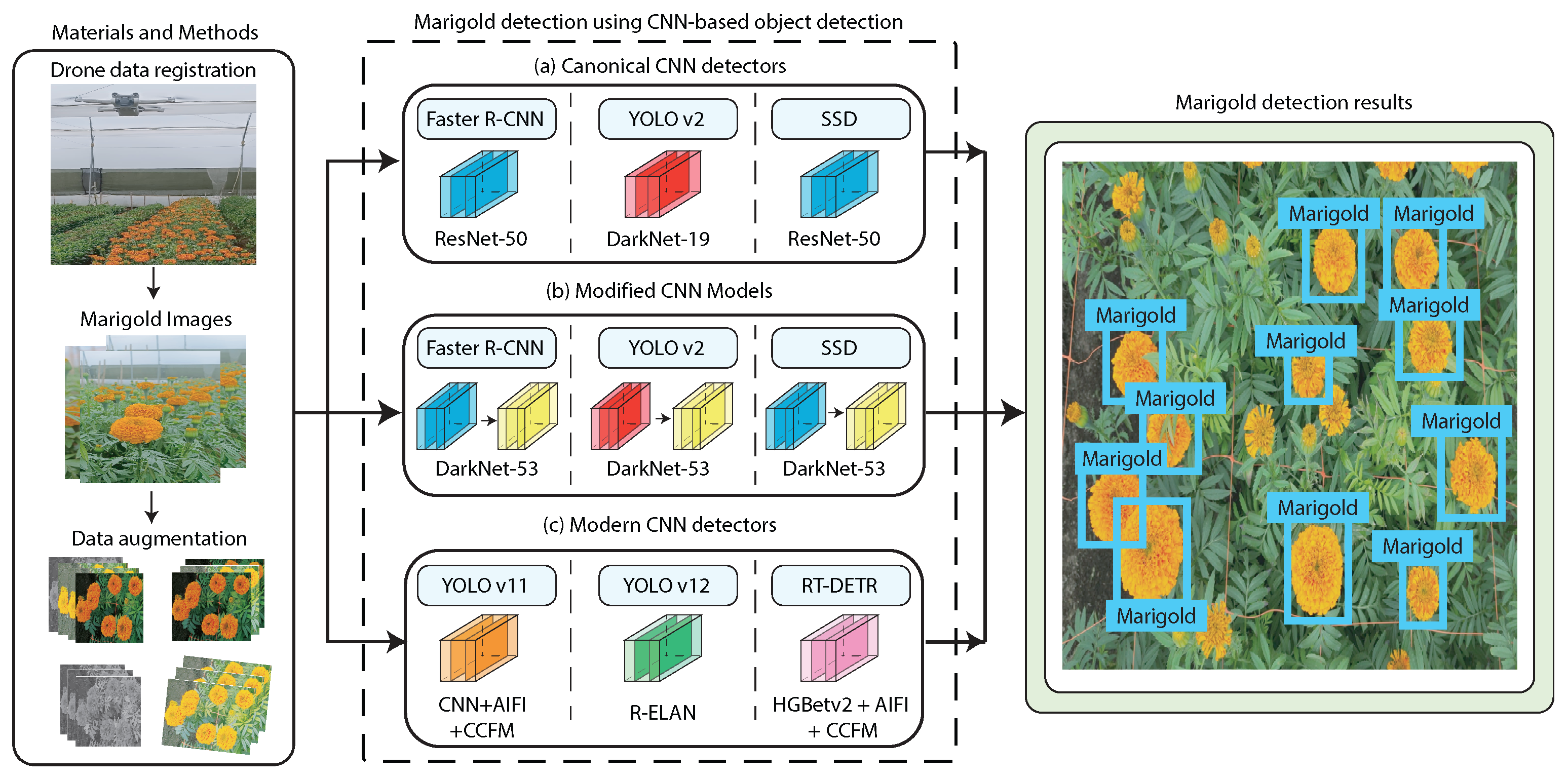 Artificial intelligence (AI) is an important tool for improving agricultural tasks. In particular, object detection methods based on convolutional neural networks (CNNs) enable the detection and classification of objects directly in the field. Combined with unmanned aerial vehicles (UAVs, drones), these methods allow efficient crop monitoring. The primary challenge is to develop models that are both accurate and feasible under real-world conditions. This study addresses this challenge by evaluating marigold flower detection using three groups of CNN detectors: canonical models, including YOLOv2, Faster R-CNN, and SSD with their original backbones; modified versions of these detectors using DarkNet-53; and modern architectures, including YOLOv11, YOLOv12, and the RT-DETR. The dataset consisted of 392 images from marigold fields, which were manually labeled and augmented to a total of 940 images. The results showed that YOLOv2 with DarkNet-53 achieved the best performance, with 98.8% mean average precision (mAP) and 97.9% F1-score (F1). SSD and Faster R-CNN also improved, reaching 63.1% and 52.8%, respectively. Modern models obtained strong results: YOLOv11 and YOLOv12 reached 96–97%, and RT-DETR 93.5%. The modification of YOLOv2 allowed this classical detector to compete directly with, and even surpass, recent models. Precision–recall (PR) curves, F1-scores, and complexity analysis confirmed the trade-offs between accuracy and efficiency. These findings demonstrate that while modern detectors are efficient baselines, classical models with updated backbones can still deliver state-of-the-art results for UAV-based crop monitoring.